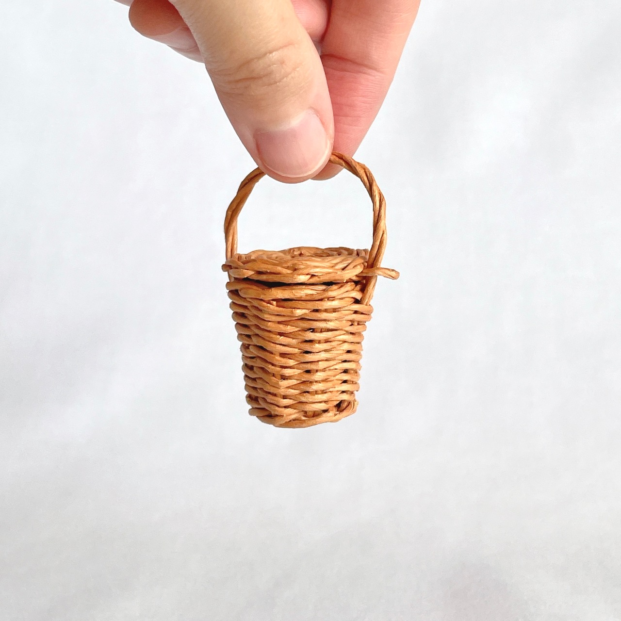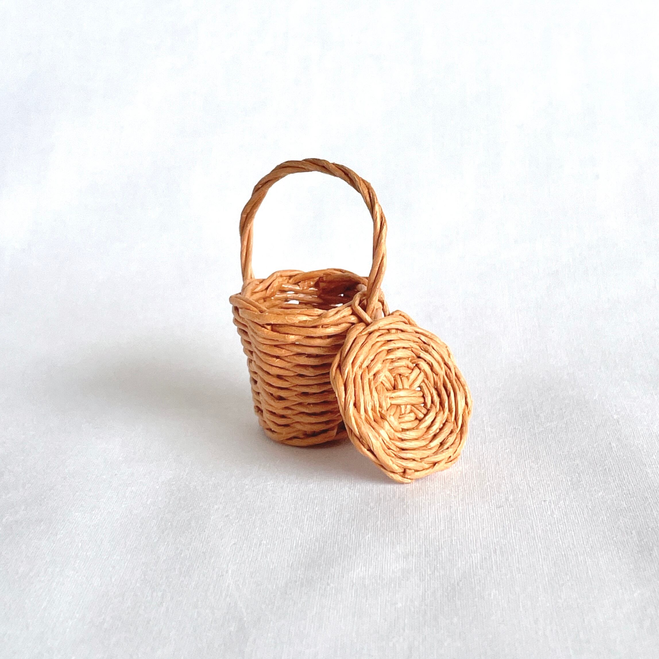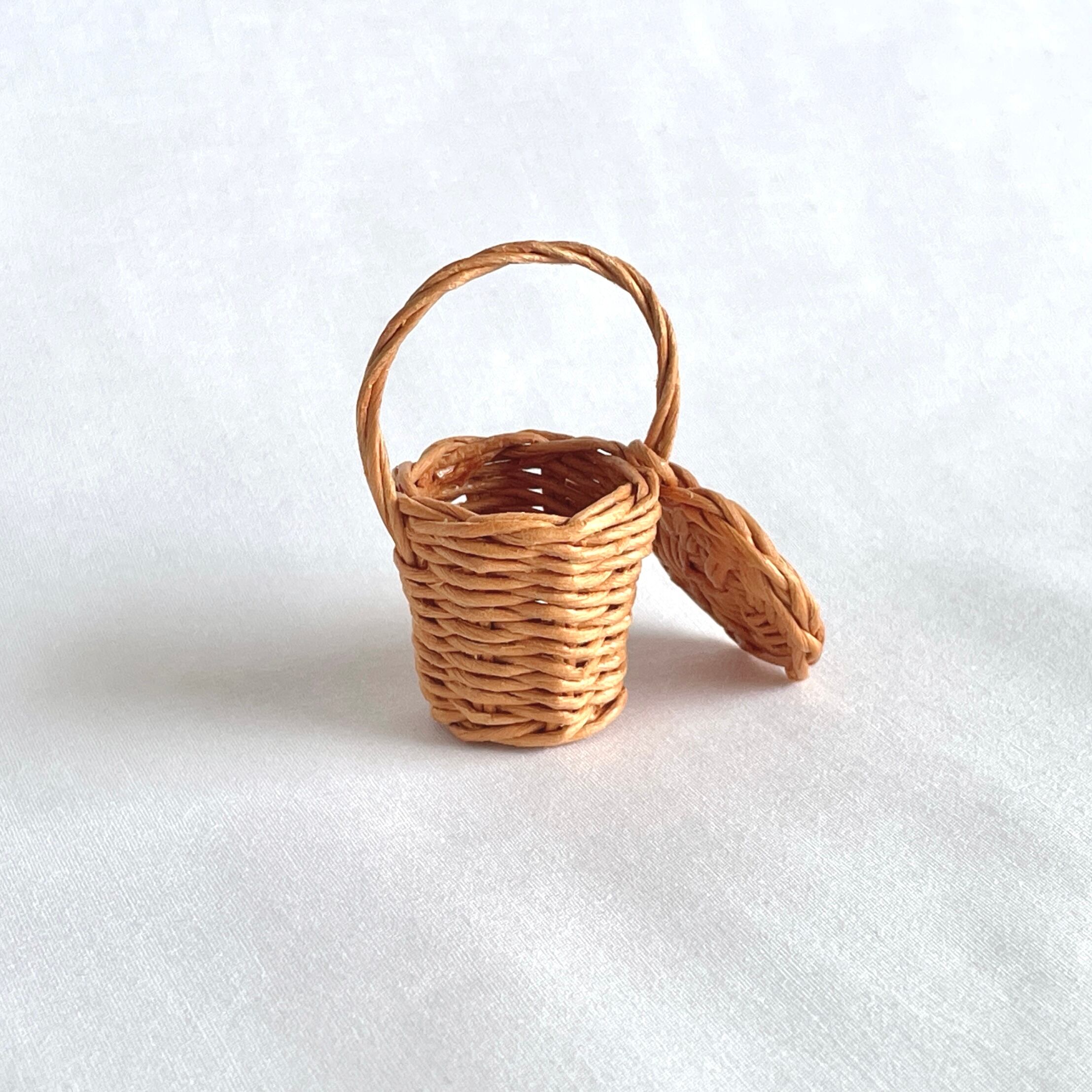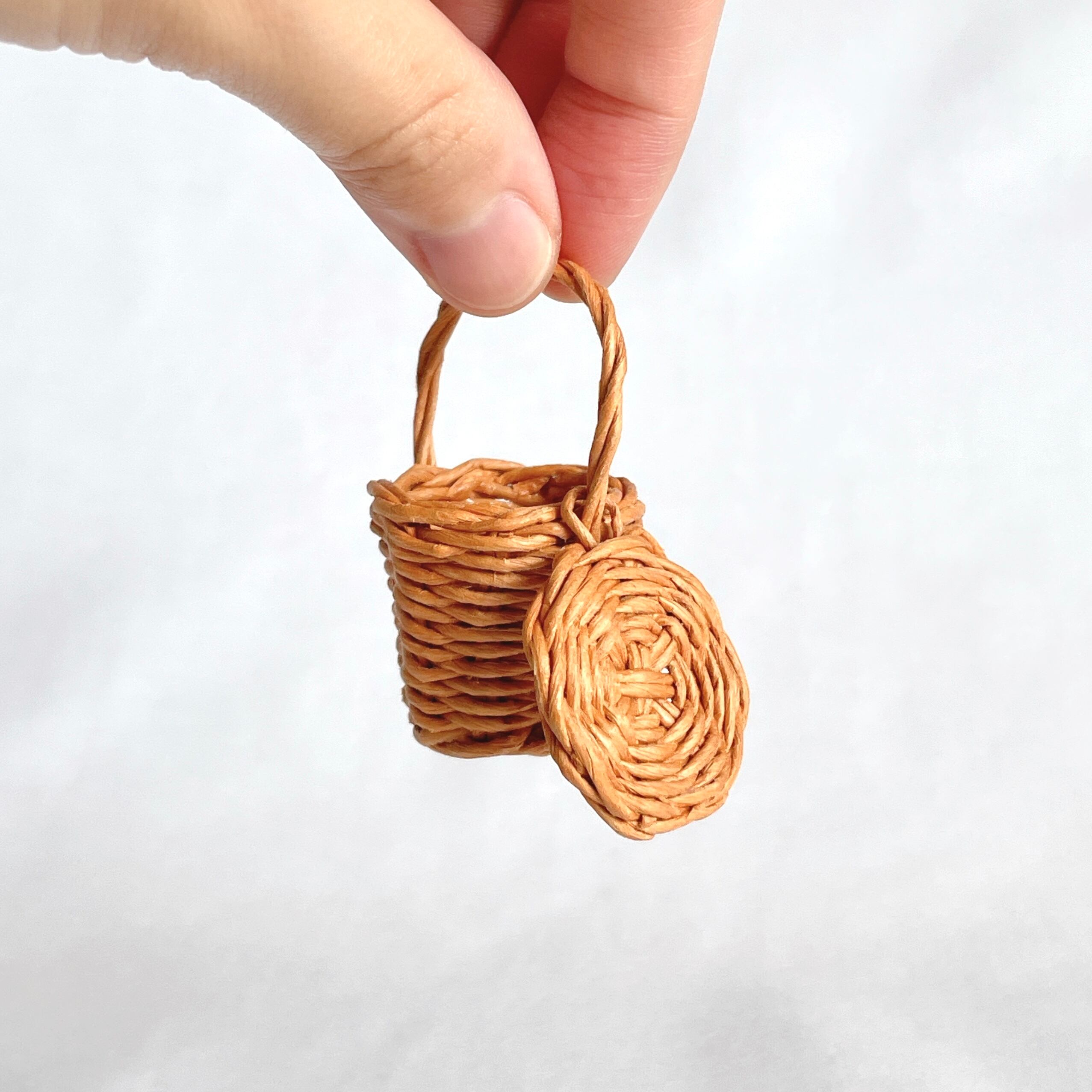◾️クラフトバンドを使って、ラタン風のミニチュア蓋付きワンハンドルバスケットを編みました。細部までこだわって、丁寧に作り上げております。蓋を閉めても開けても可愛らしいバスケットです。