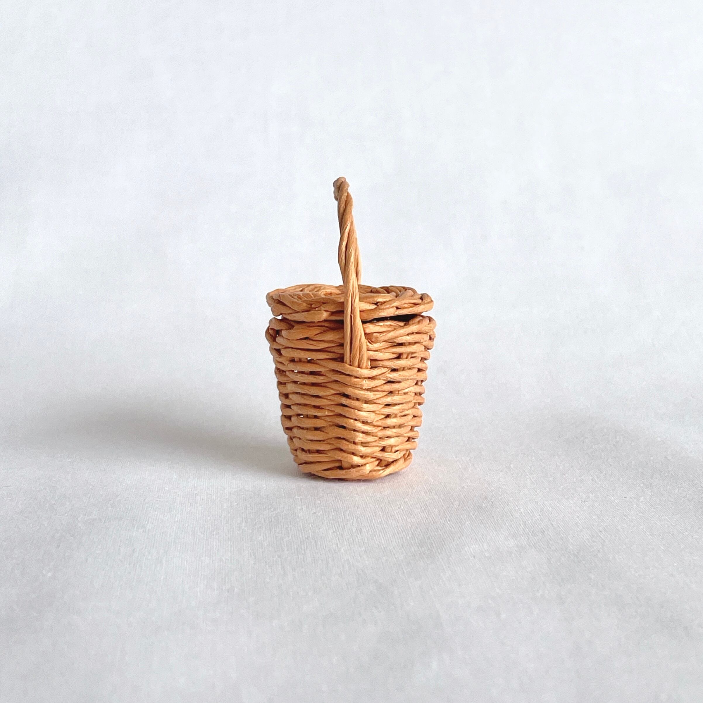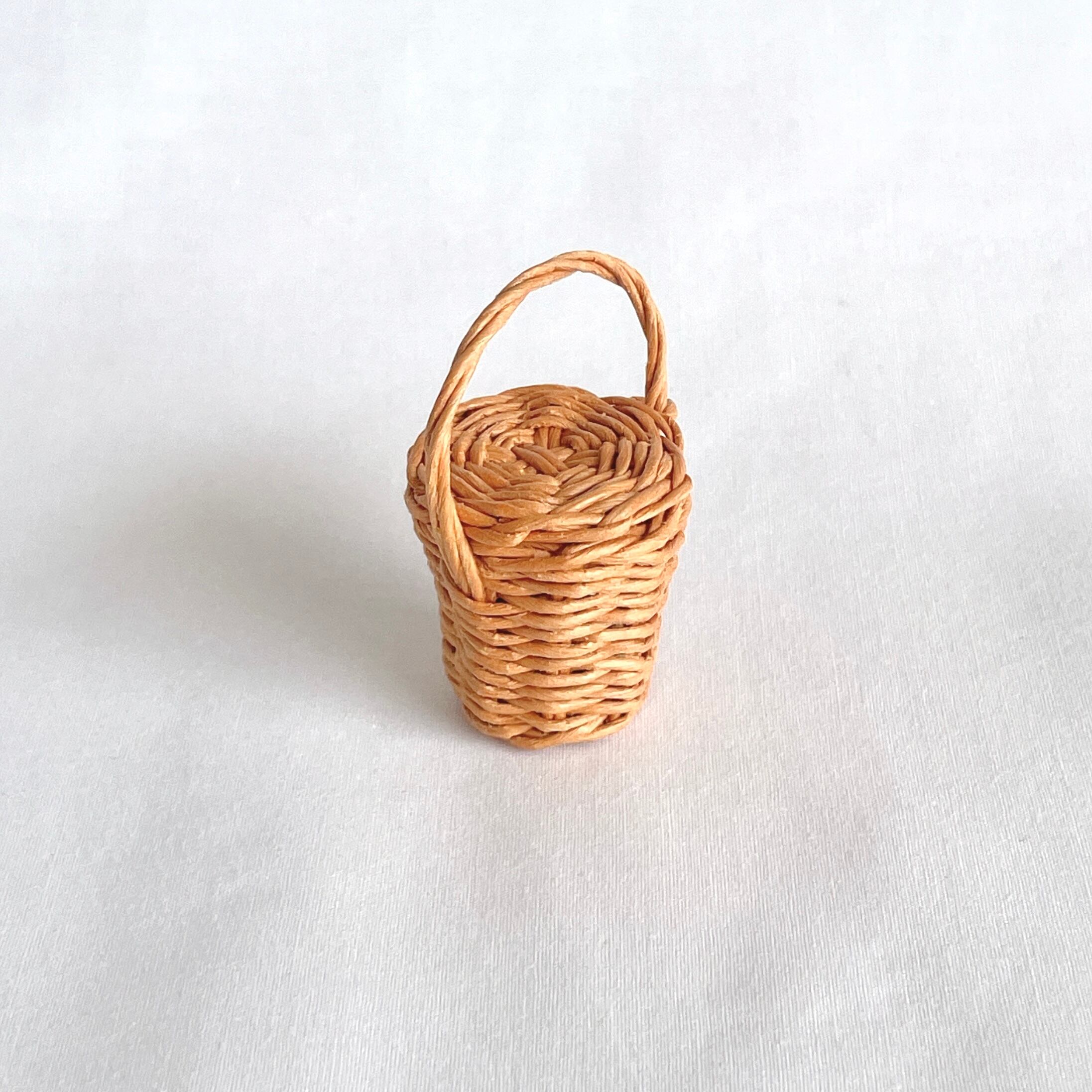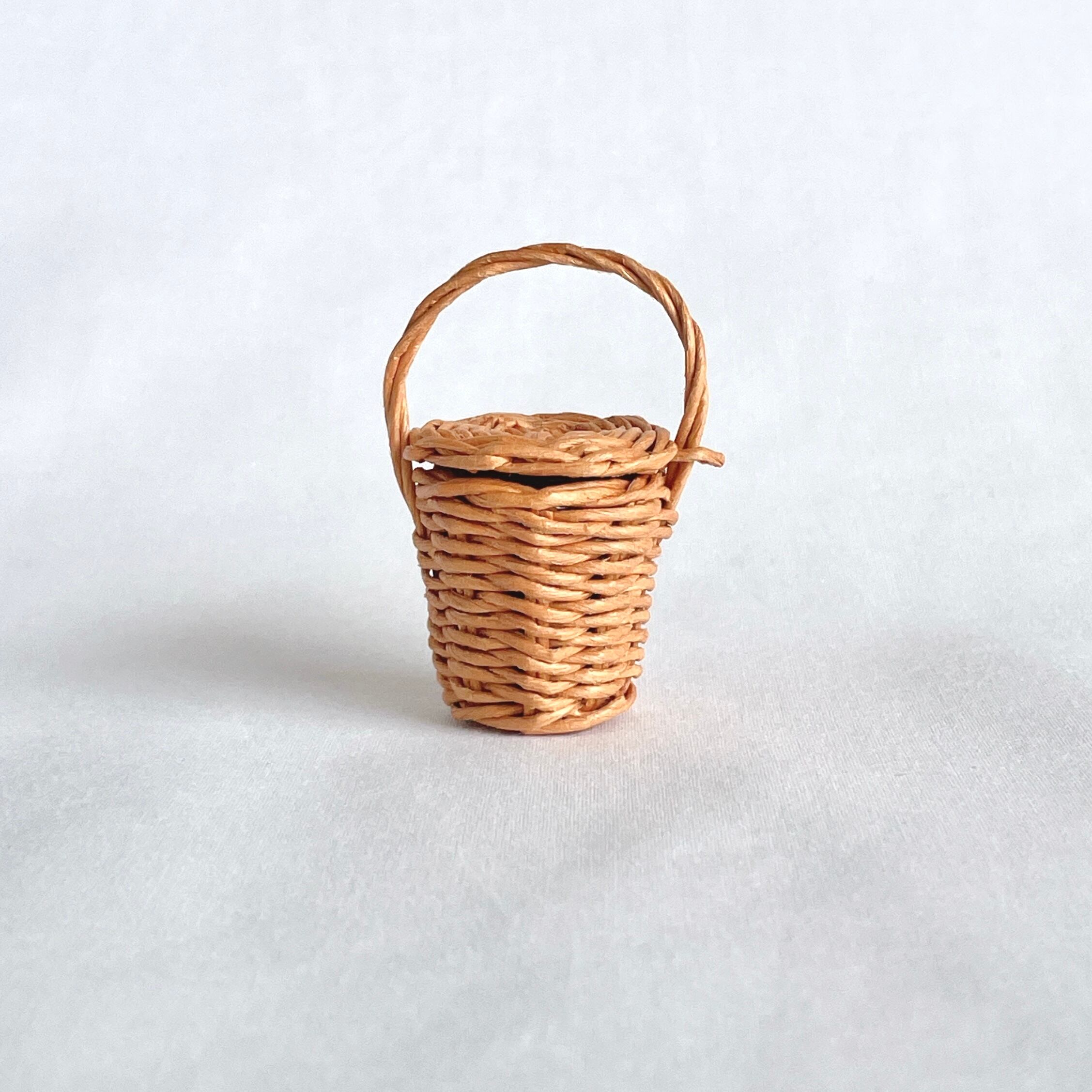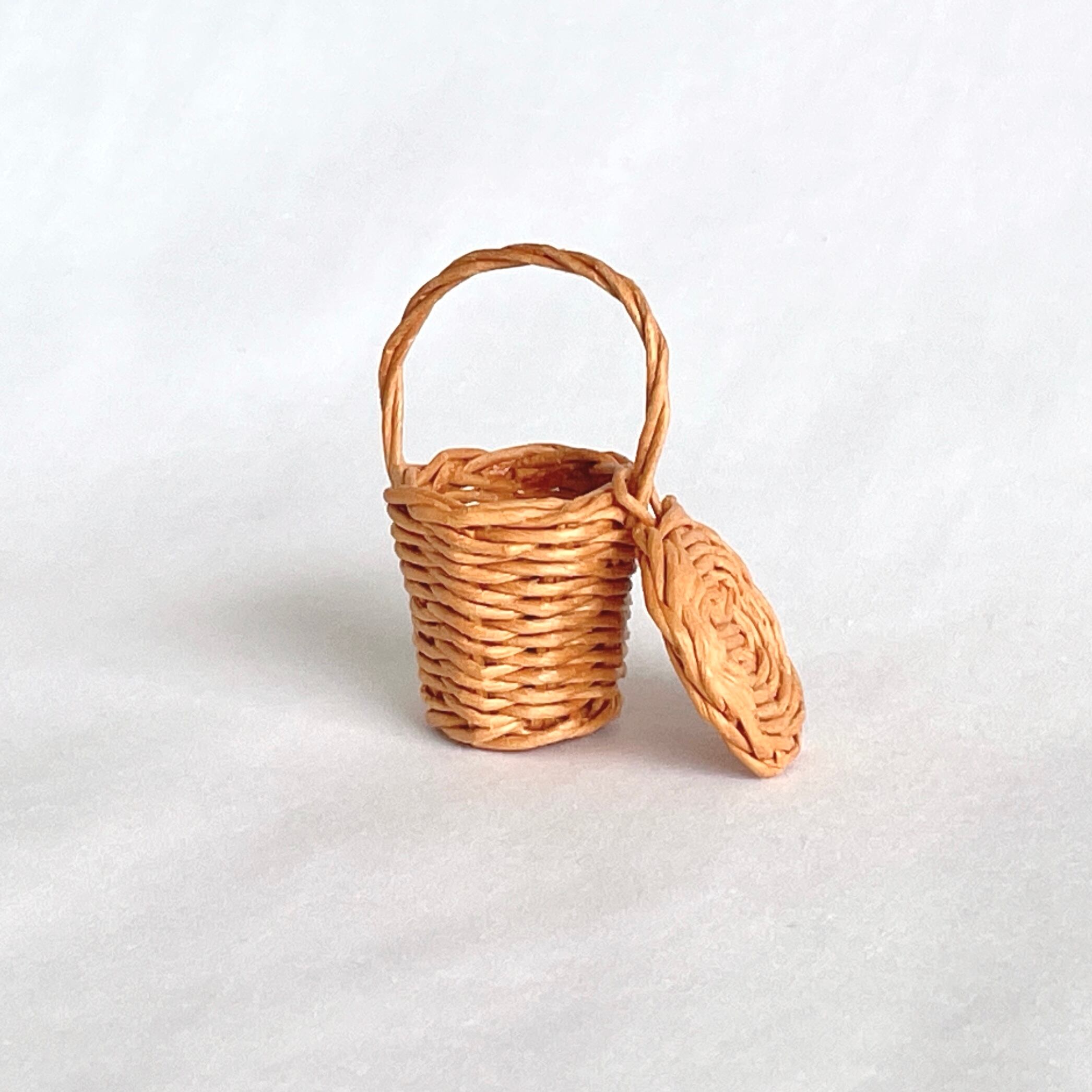 ◾️クラフトバンドを使って、ラタン風のミニチュア蓋付きワンハンドルバスケットを編みました。細部までこだわって、丁寧に作り上げております。蓋を閉めても開けても可愛らしいバスケットです。
