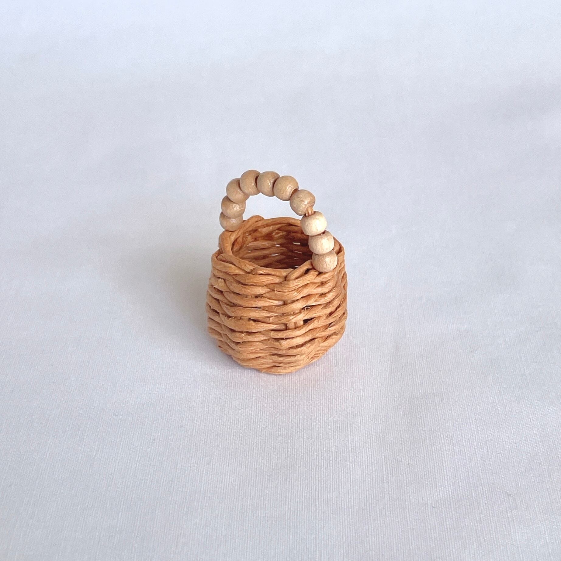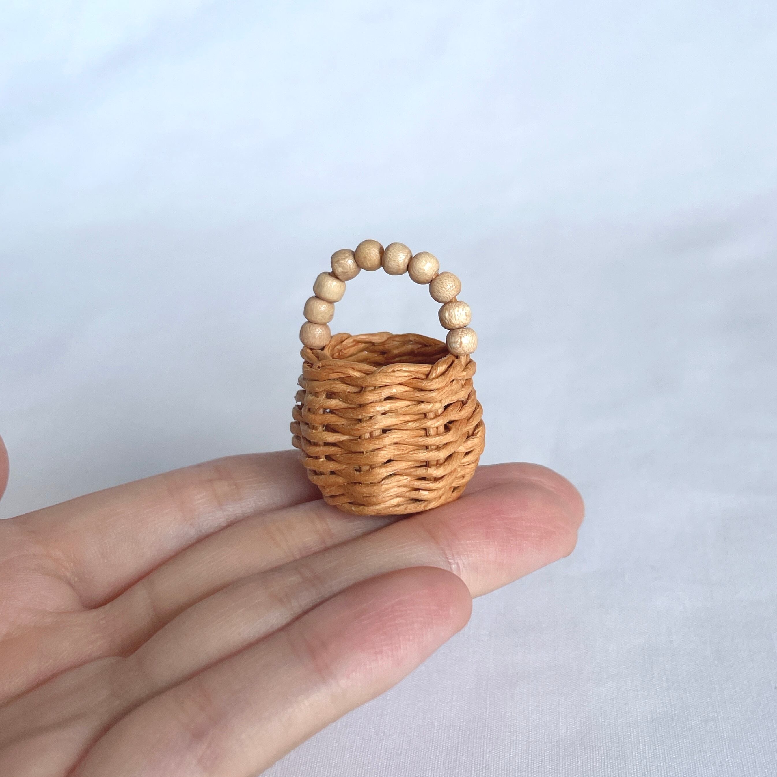 ◾️クラフトバンドを使って、ミニチュアのラタン風カゴバッグを編みました。細部までこだわって、丁寧に作り上げております。ショップ名のhinoki(桧・ひのき)にちなんで、持ち手部分にウッドビーズを使用しているところがポイントです。