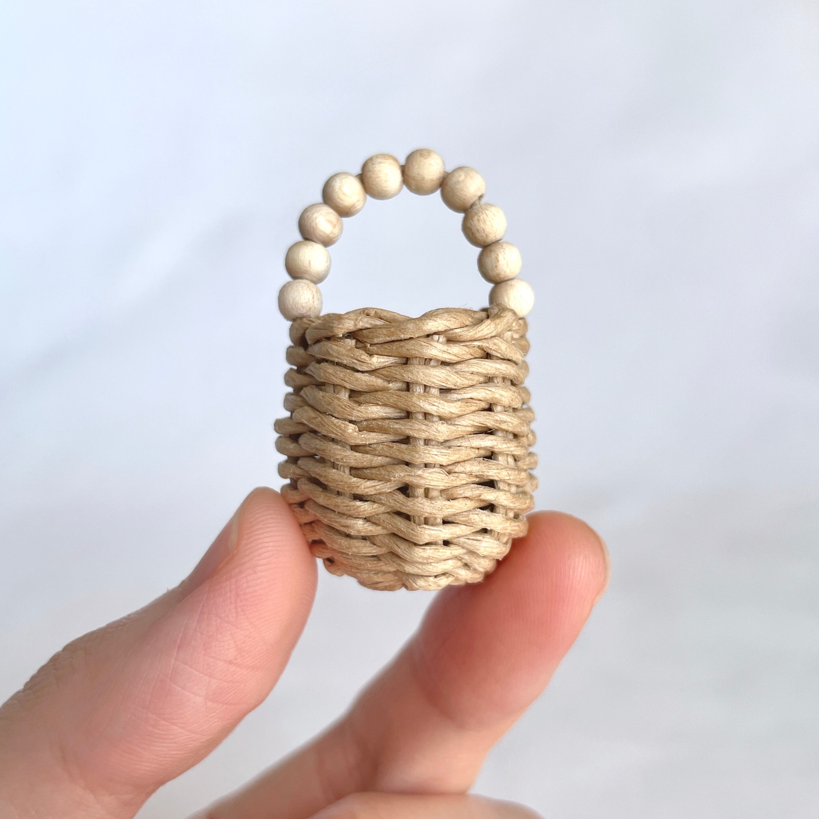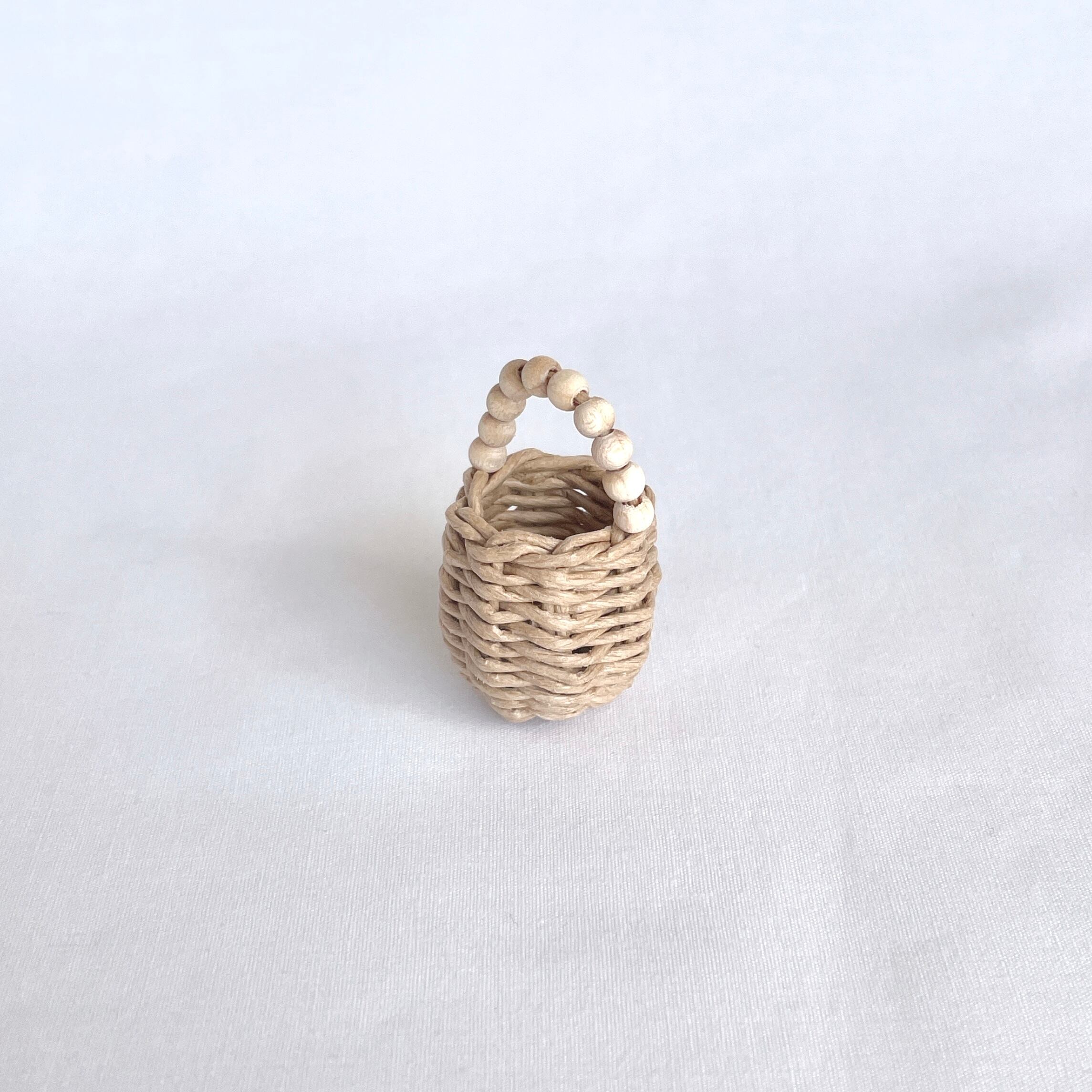 ◾️クラフトバンドを使って、ミニチュアのラタン風カゴバッグを編みました。細部までこだわって、丁寧に作り上げております。ショップ名のhinoki(桧・ひのき)にちなんで、持ち手部分にウッドビーズを使用しているところがポイントです。