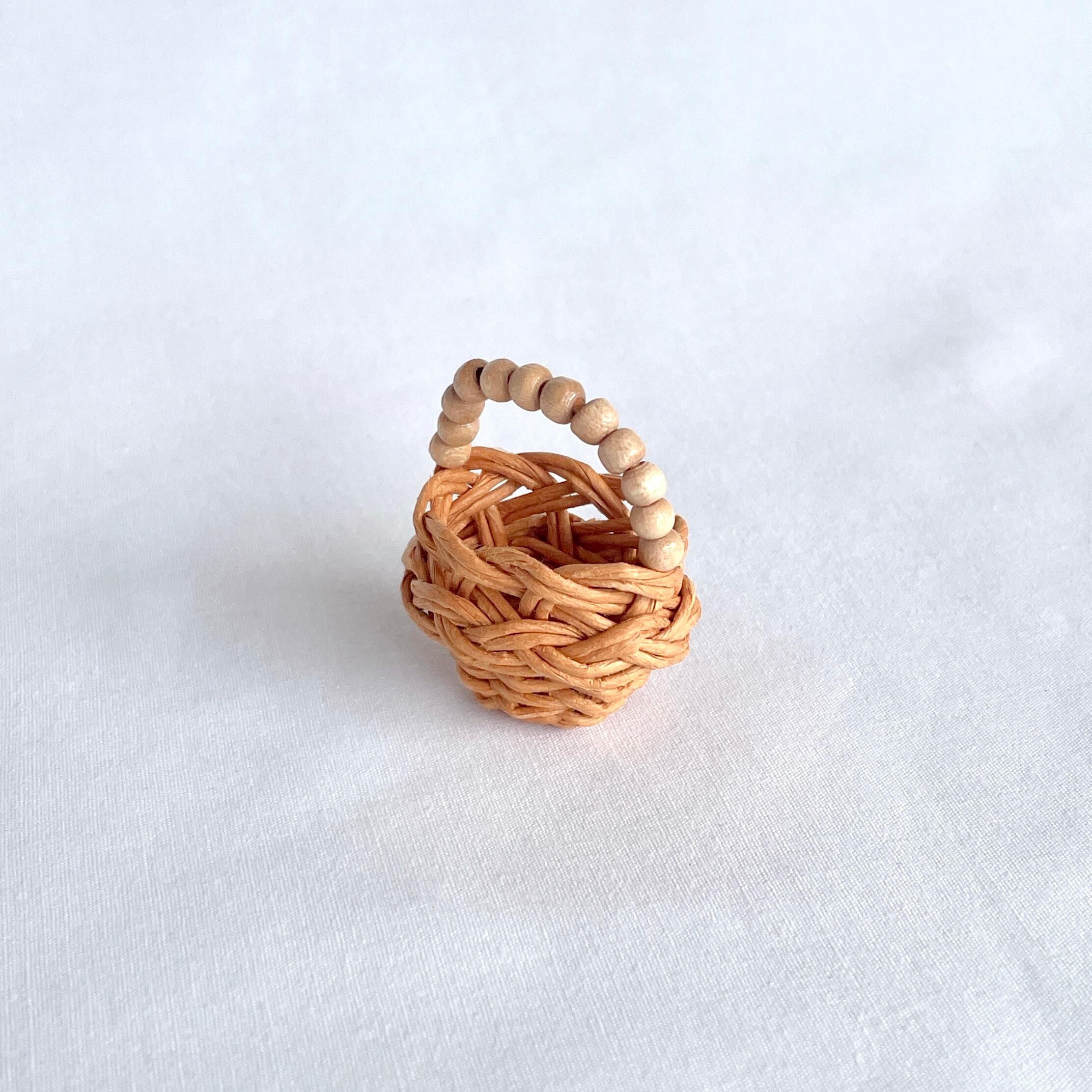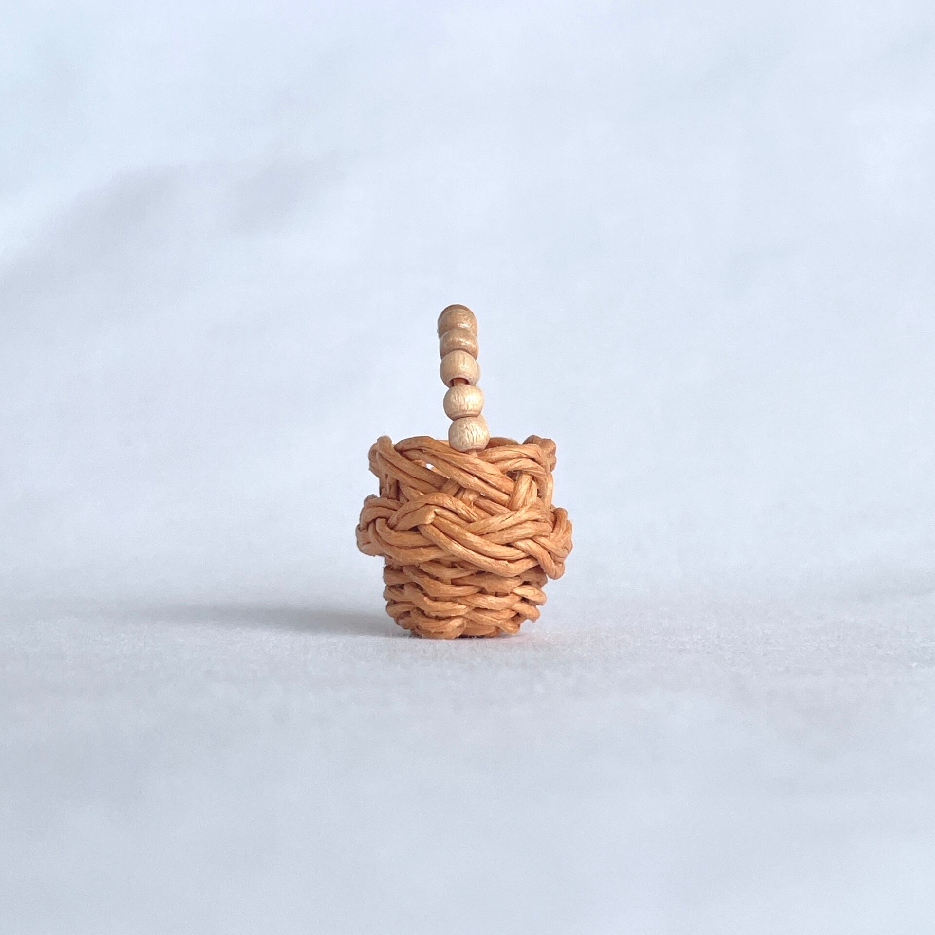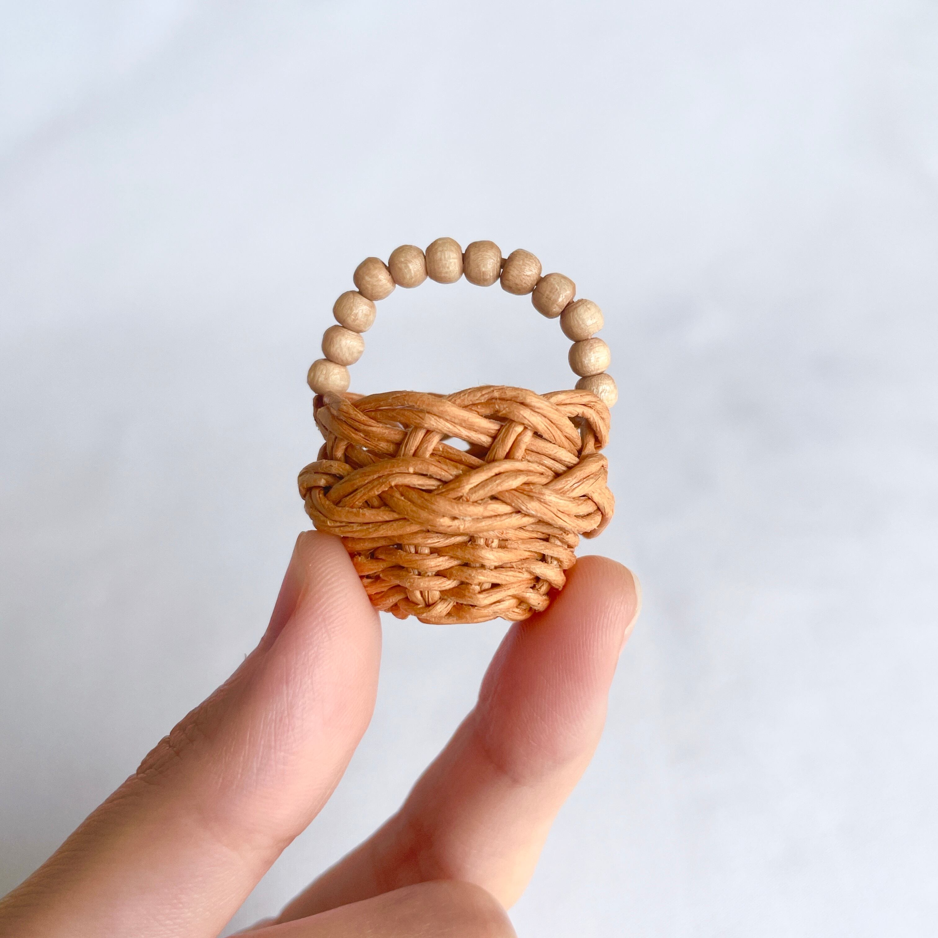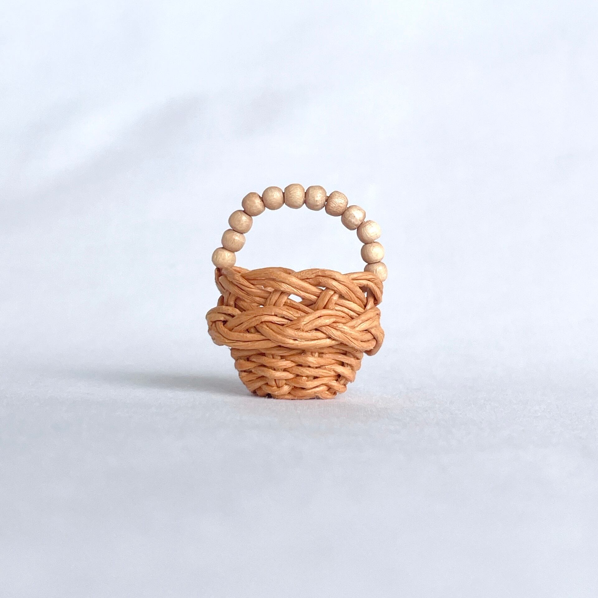 ◾️クラフトバンドを使って、ミニチュアのラタン風カゴバッグを編みました。細部までこだわって、丁寧に作り上げております。ショップ名のhinoki(桧・ひのき)にちなんで、持ち手部分にウッドビーズを使用しているところがポイントです。