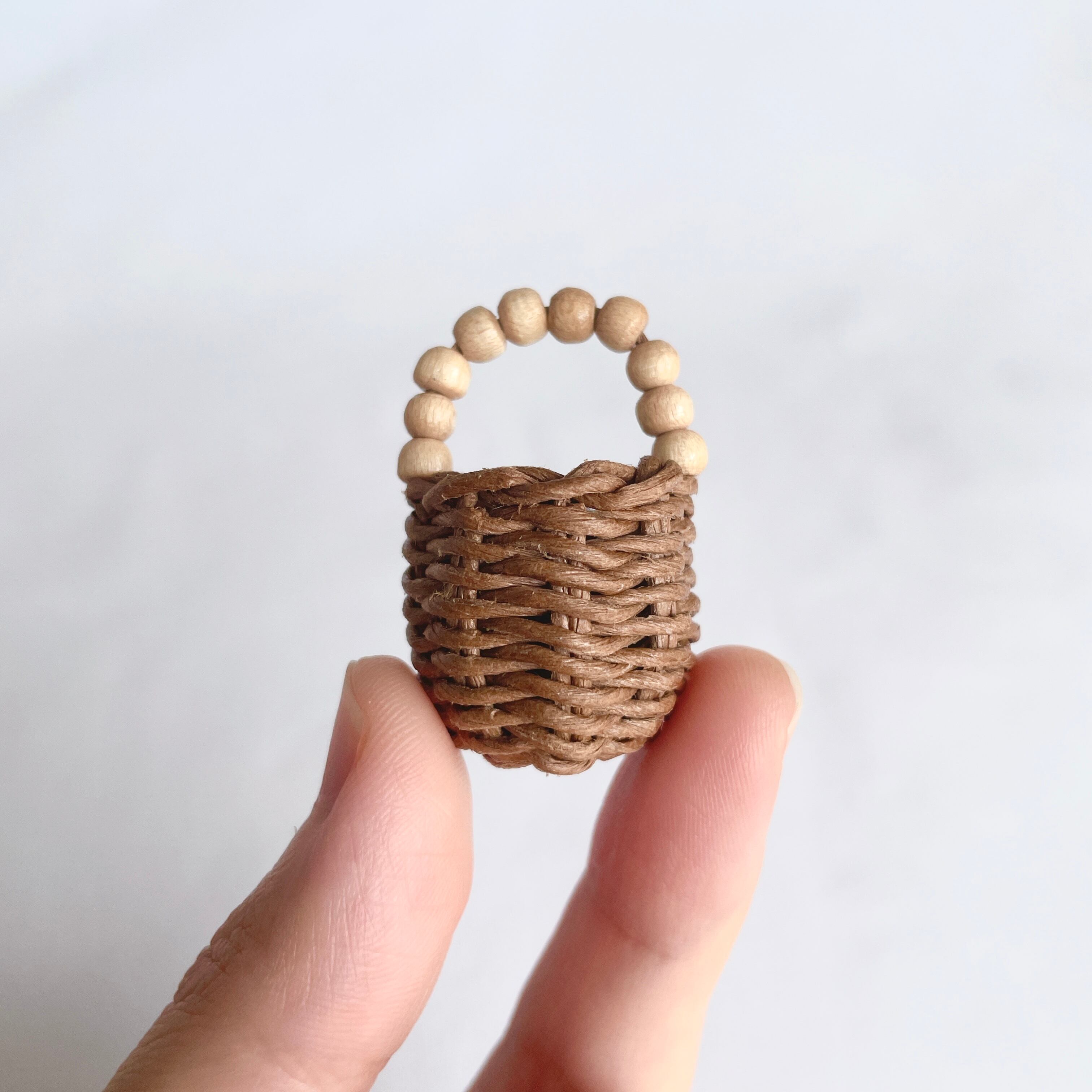 ◾️クラフトバンドを使って、ミニチュアのラタン風カゴバッグを編みました。細部までこだわって、丁寧に作り上げております。ショップ名のhinoki(桧・ひのき)にちなんで、持ち手部分にウッドビーズを使用しているところがポイントです。