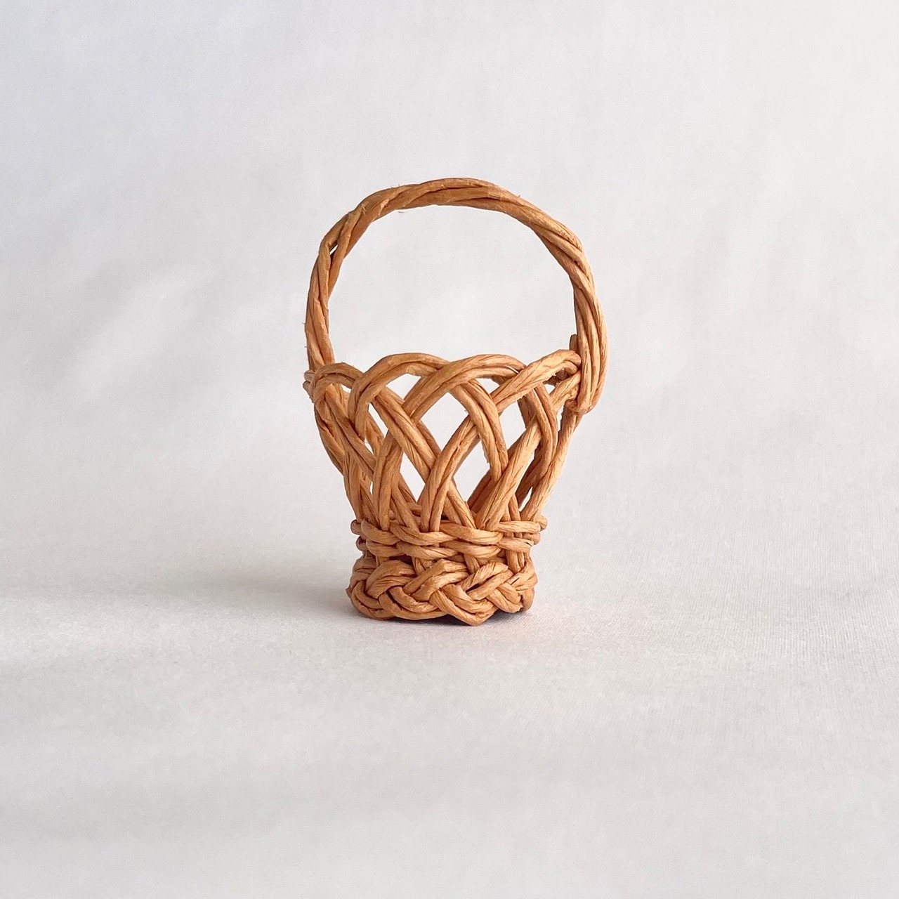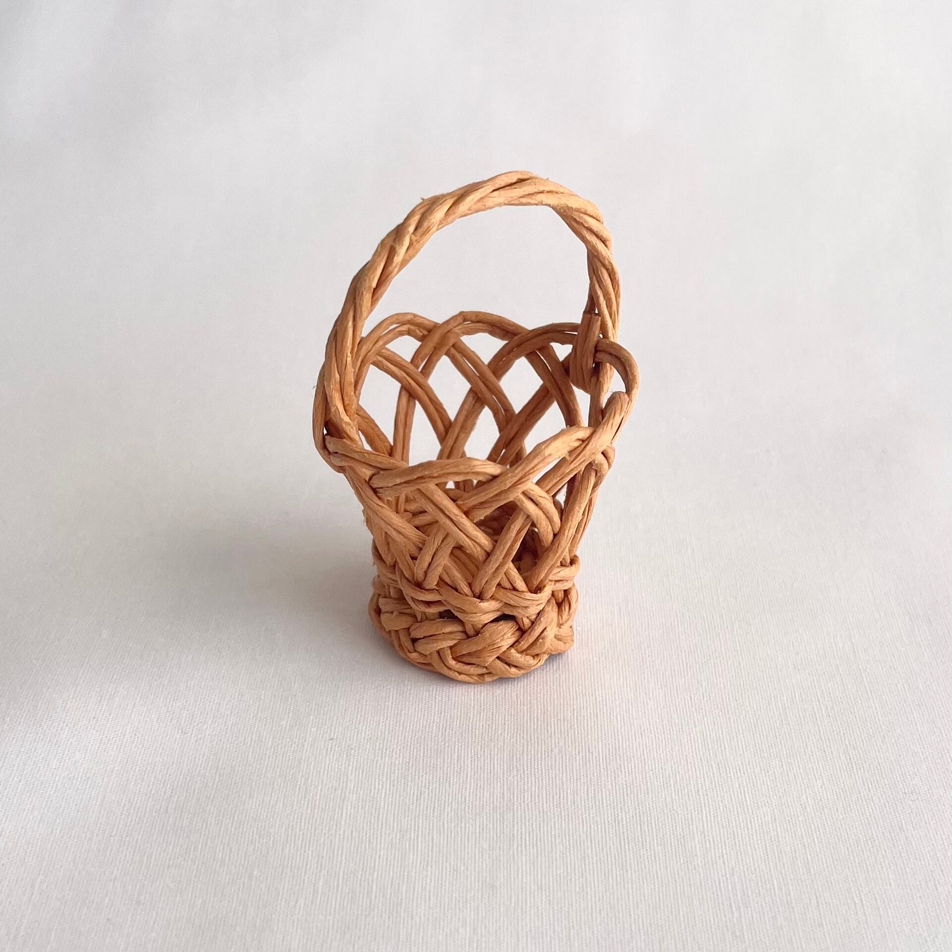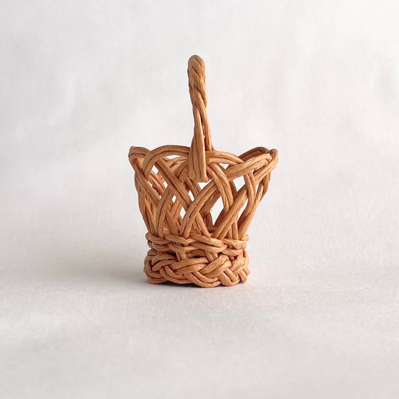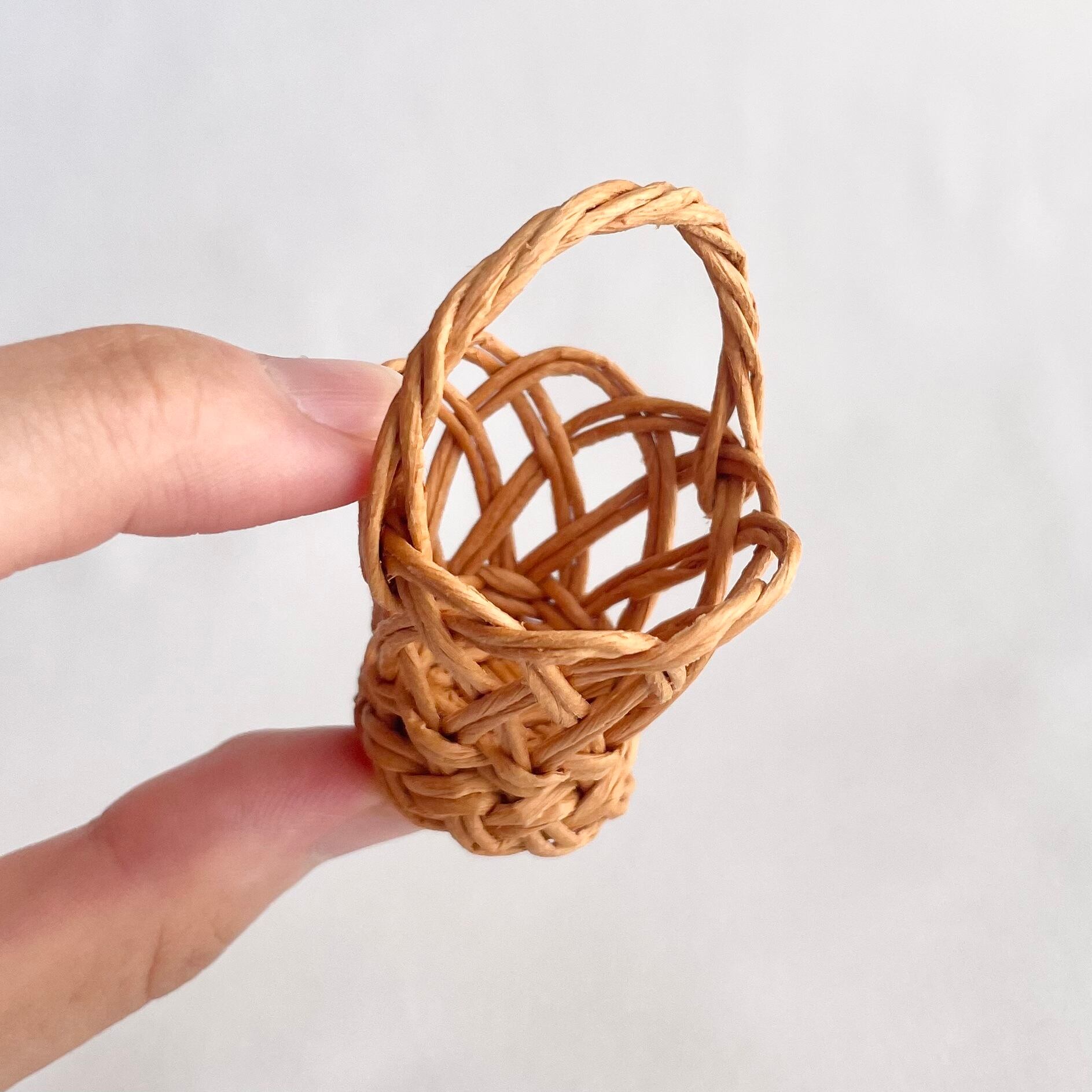 ◾️クラフトバンドを使って、ラタン風のミニチュアカゴバッグを編みました。細部までこだわって、丁寧に作り上げております。見る角度によってさまざまな表情を見られるところが、ポイントです。
