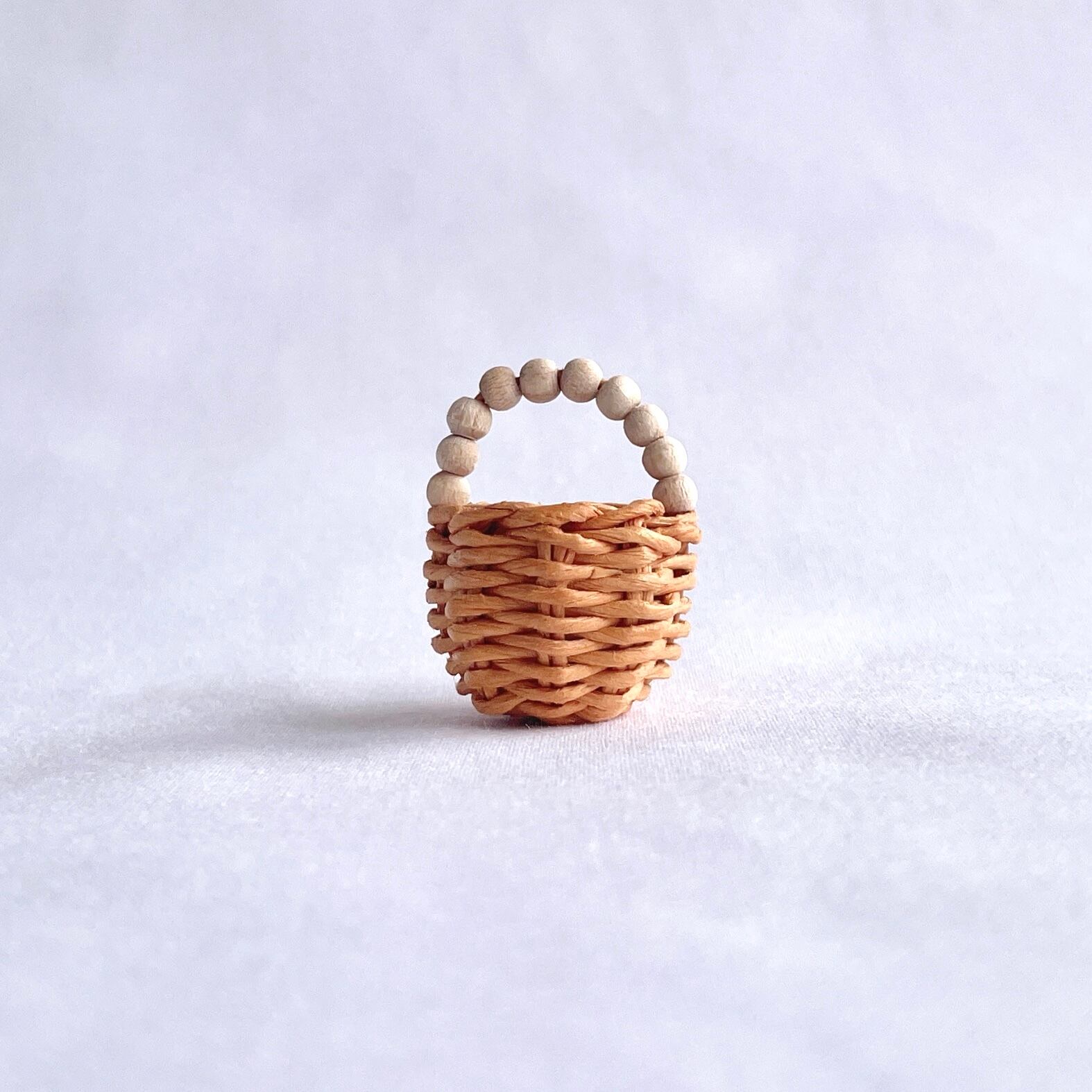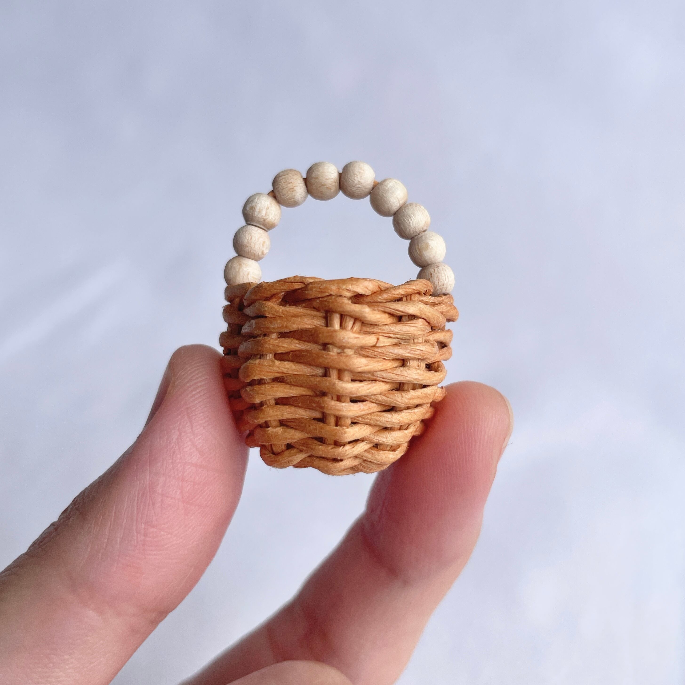 ◾️クラフトバンドを使って、ミニチュアのラタン風カゴバッグを編みました。細部までこだわって、丁寧に作り上げております。ショップ名のhinoki(桧・ひのき)にちなんで、持ち手部分にウッドビーズを使用しているところがポイントです。