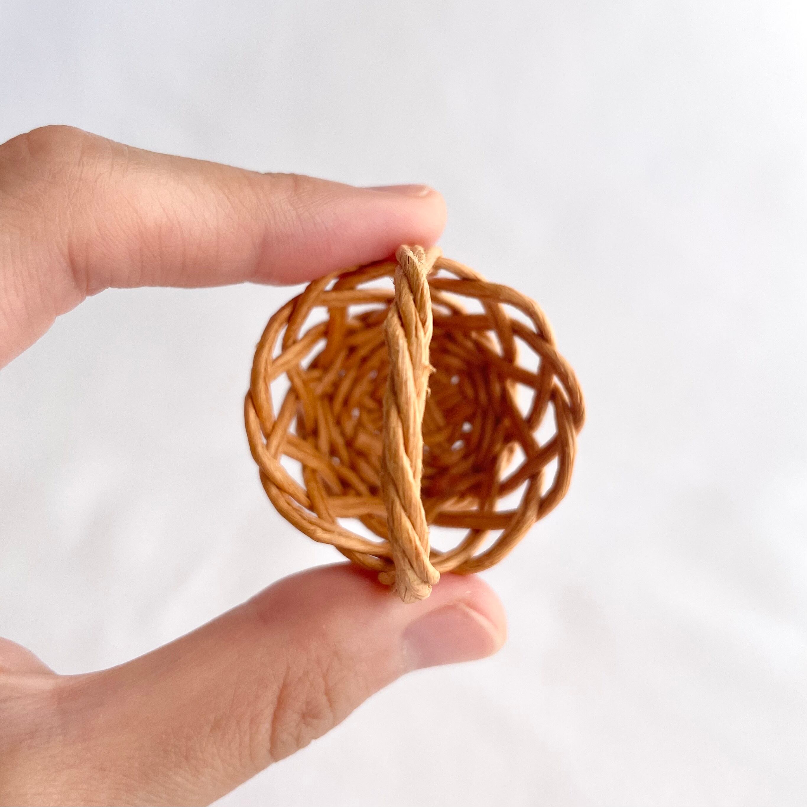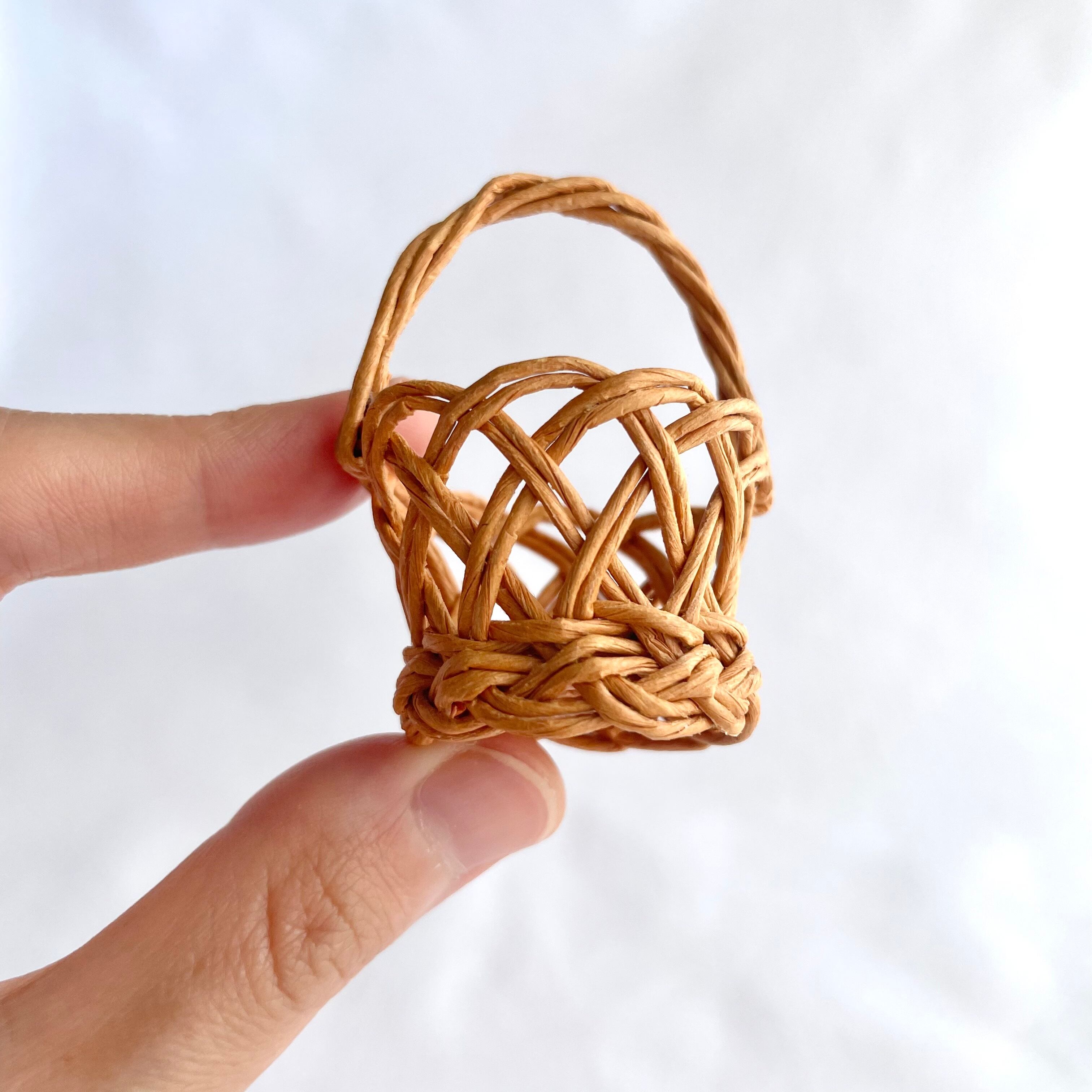 ◾️クラフトバンドを使って、ラタン風のミニチュアカゴバッグを編みました。細部までこだわって、丁寧に作り上げております。見る角度によってさまざまな表情を見られるところが、ポイントです。