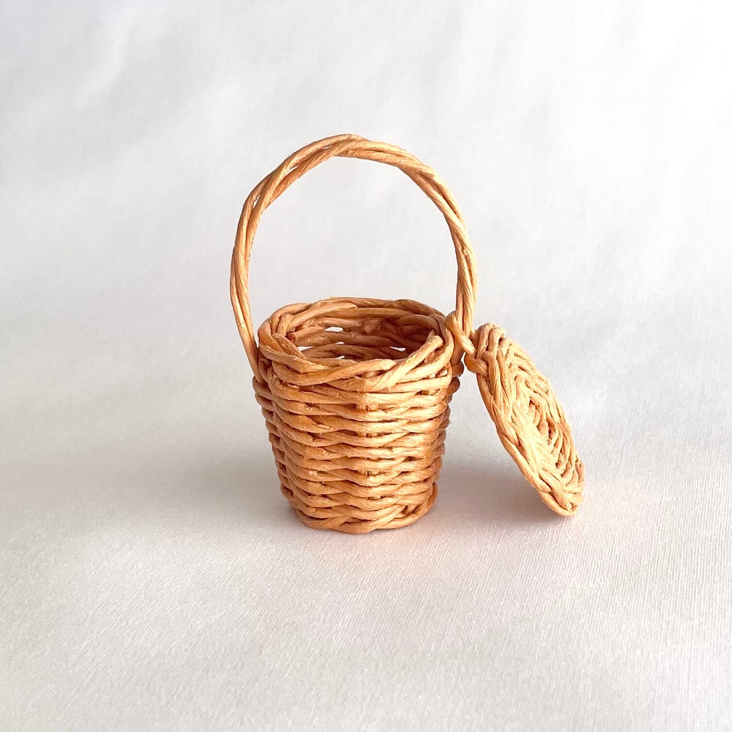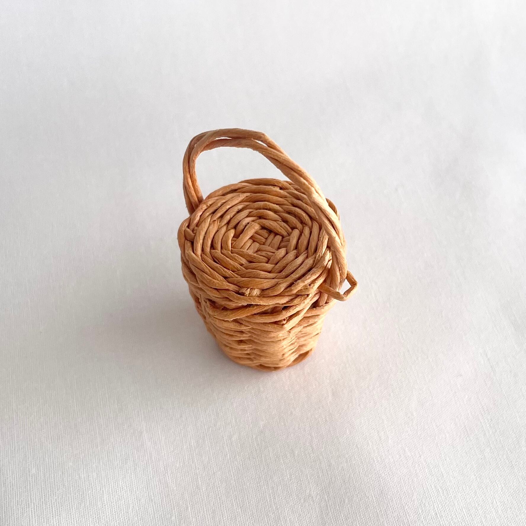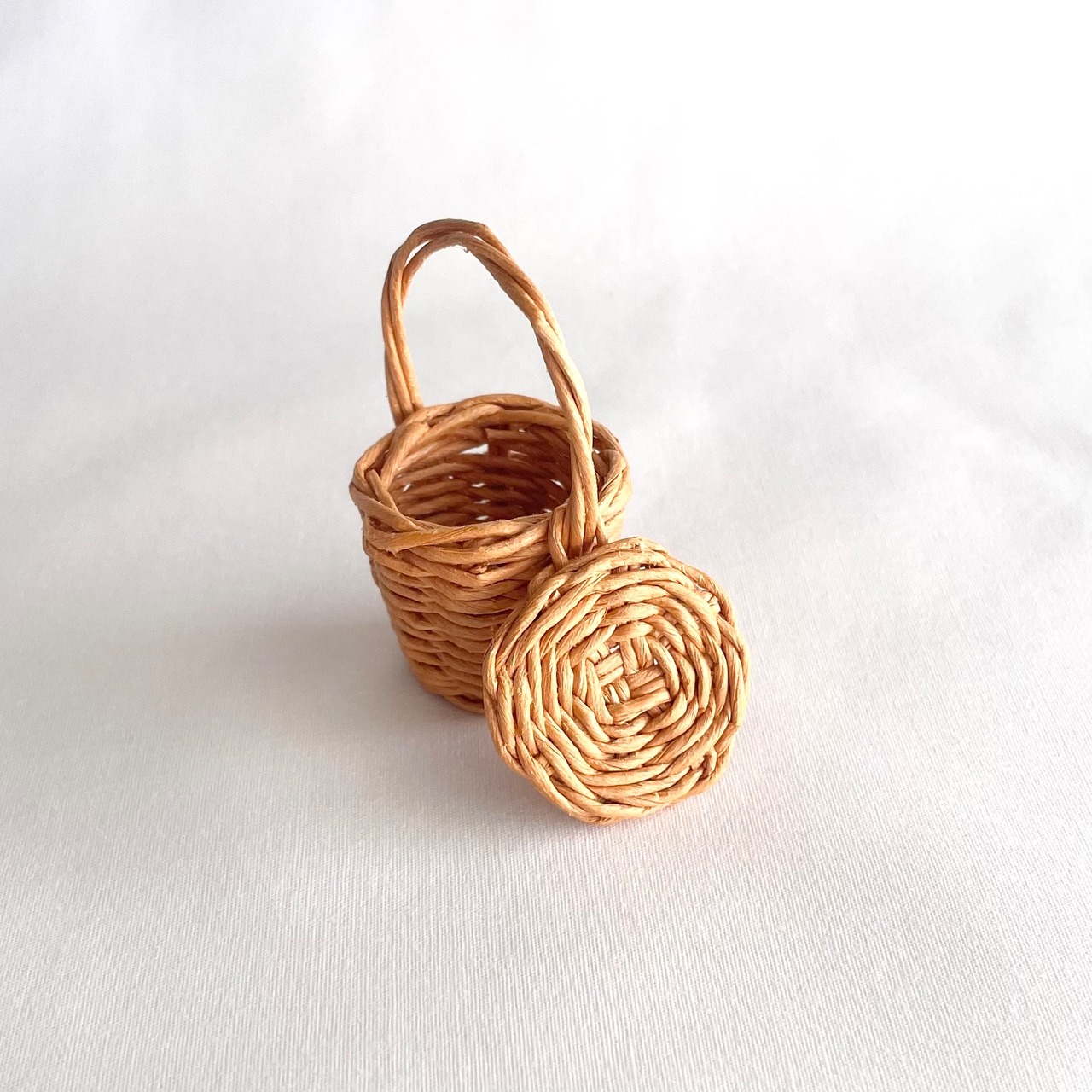 ◾️クラフトバンドを使って、ラタン風のミニチュア蓋付きワンハンドルバスケットを編みました。細部までこだわって、丁寧に作り上げております。蓋を閉めても開けても可愛らしいバスケットです。