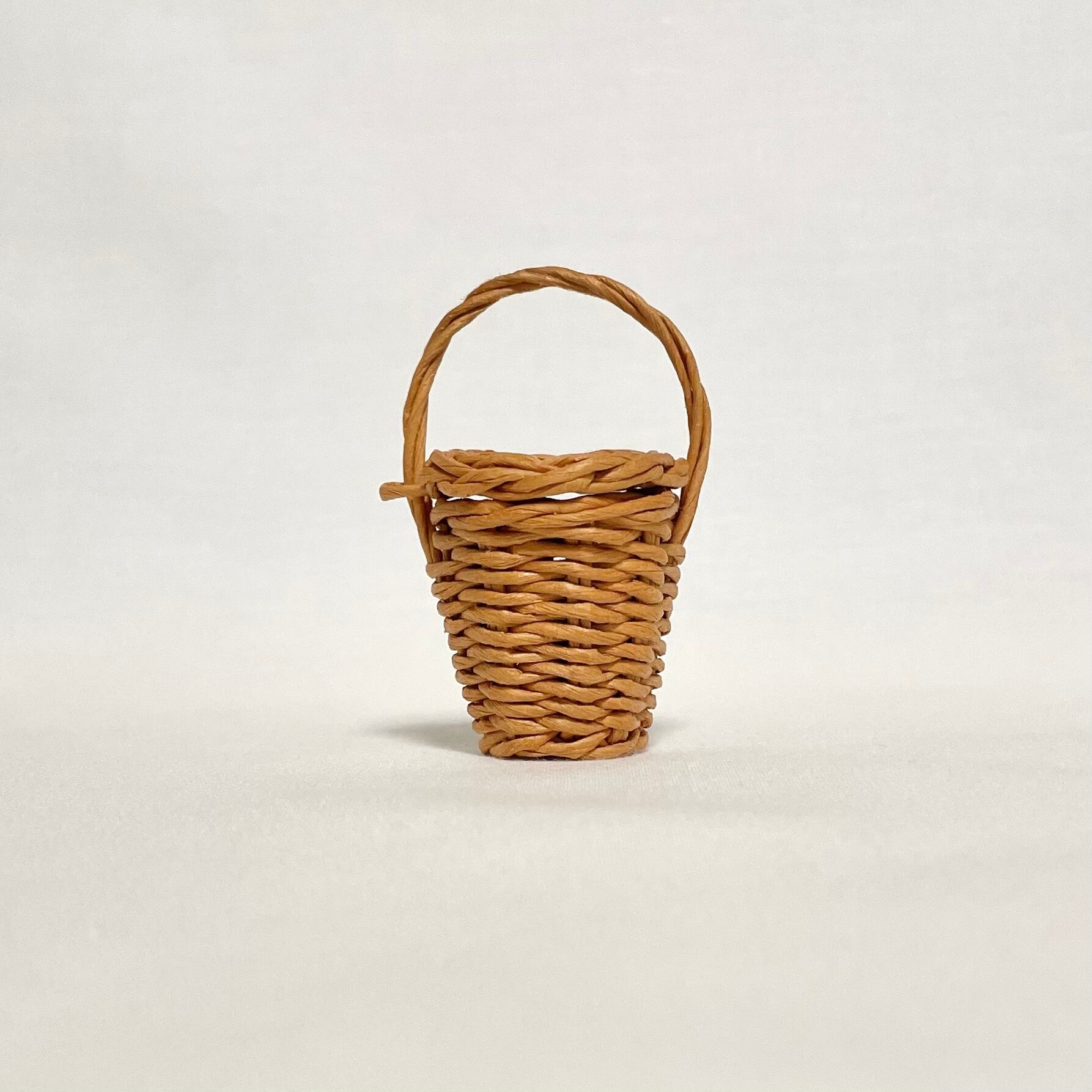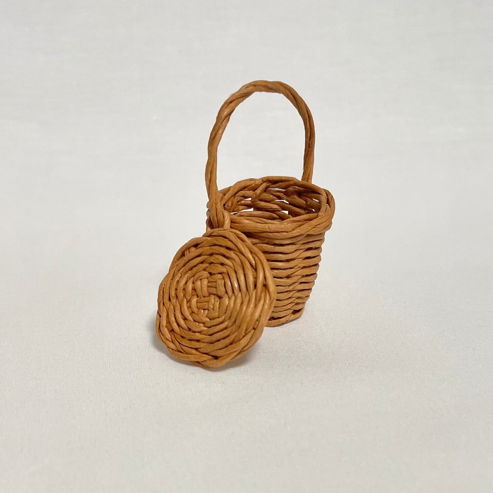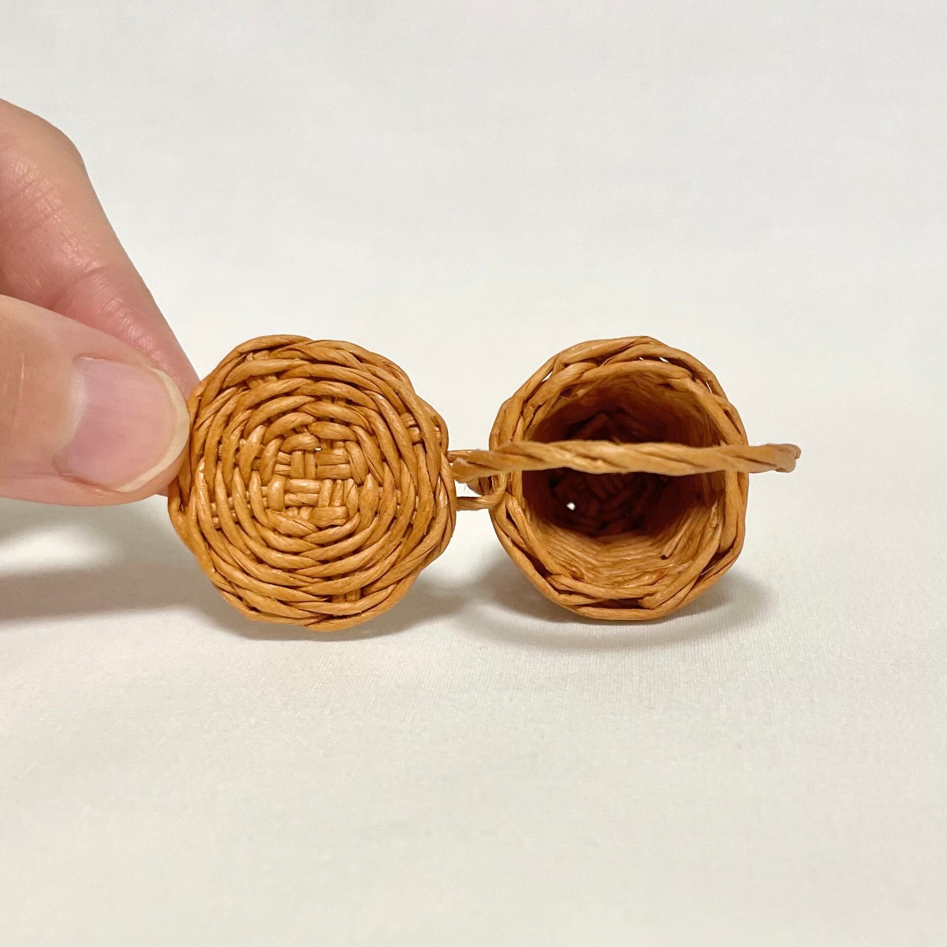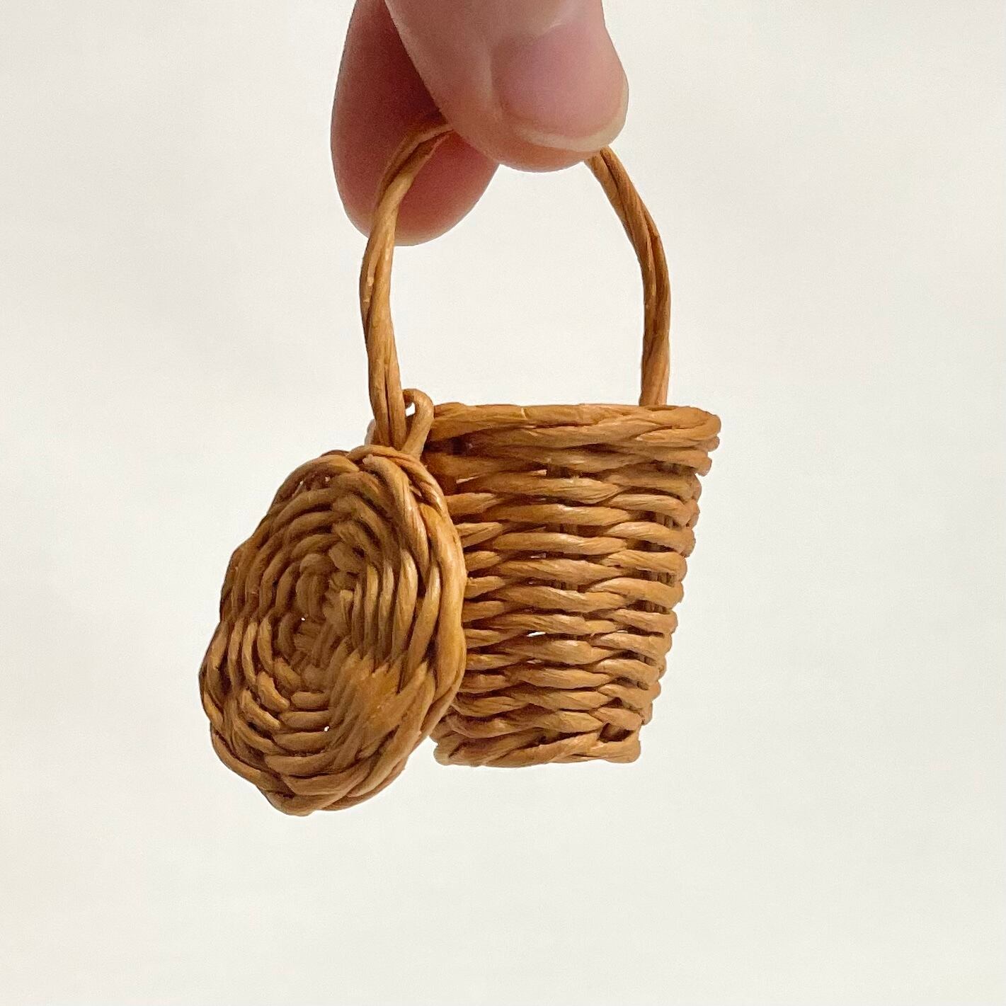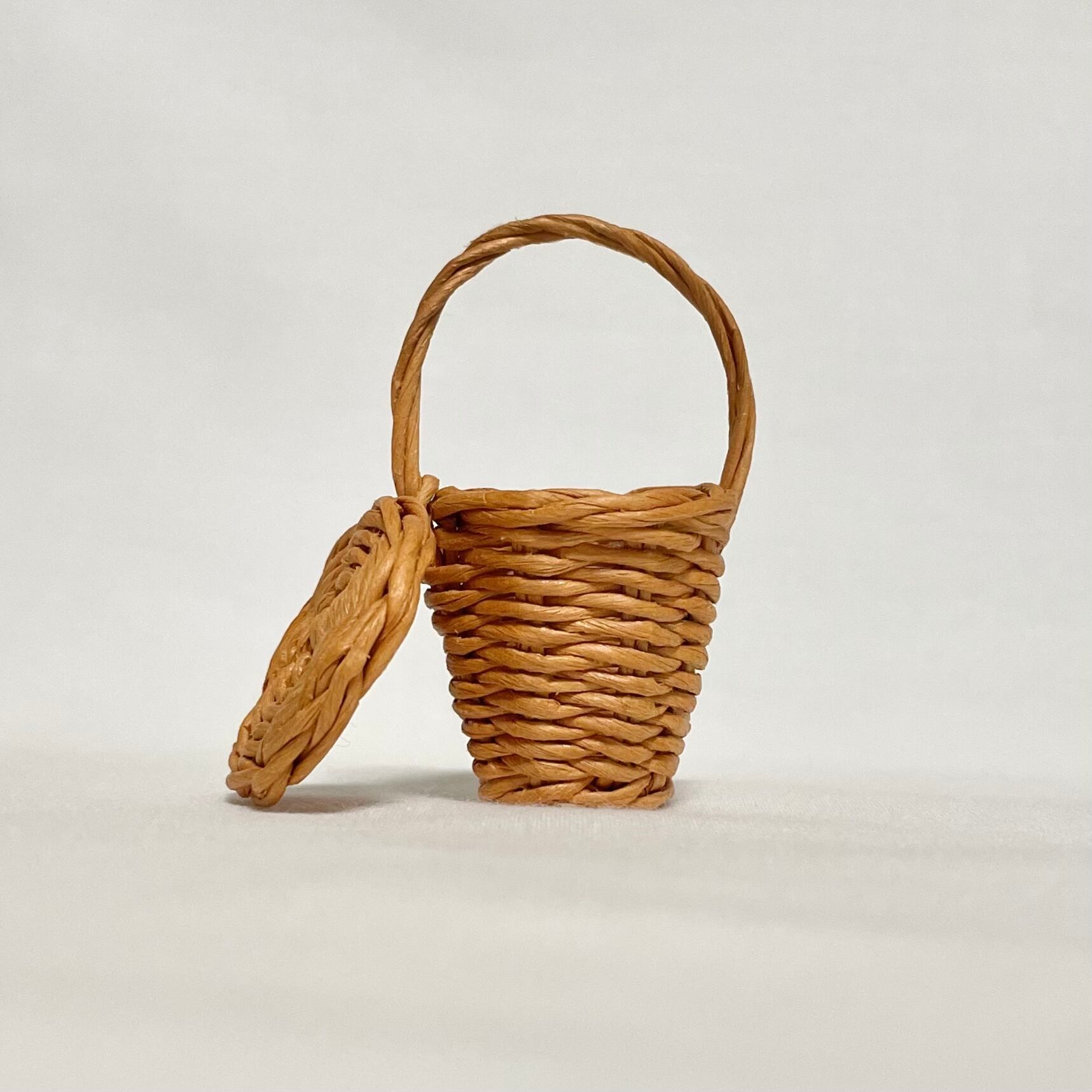 ◾️クラフトバンドを使って、ラタン風のミニチュア蓋付きワンハンドルバスケットを編みました。細部までこだわって、丁寧に作り上げております。蓋を閉めても開けても可愛らしいバスケットです。