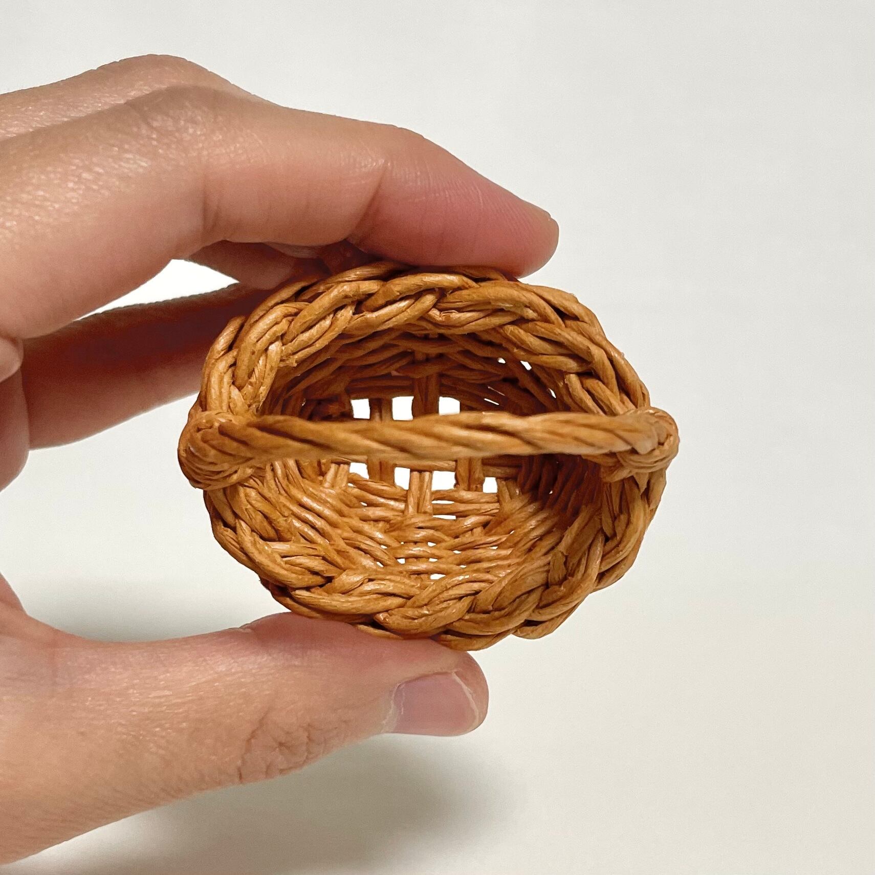 ◾️クラフトバンドを使って、ミニチュアのゆりかご型のカゴバッグを編みました。細部までこだわって、丁寧に作り上げております。縁の表裏部分が三つ編み模様になっているところがポイントです。