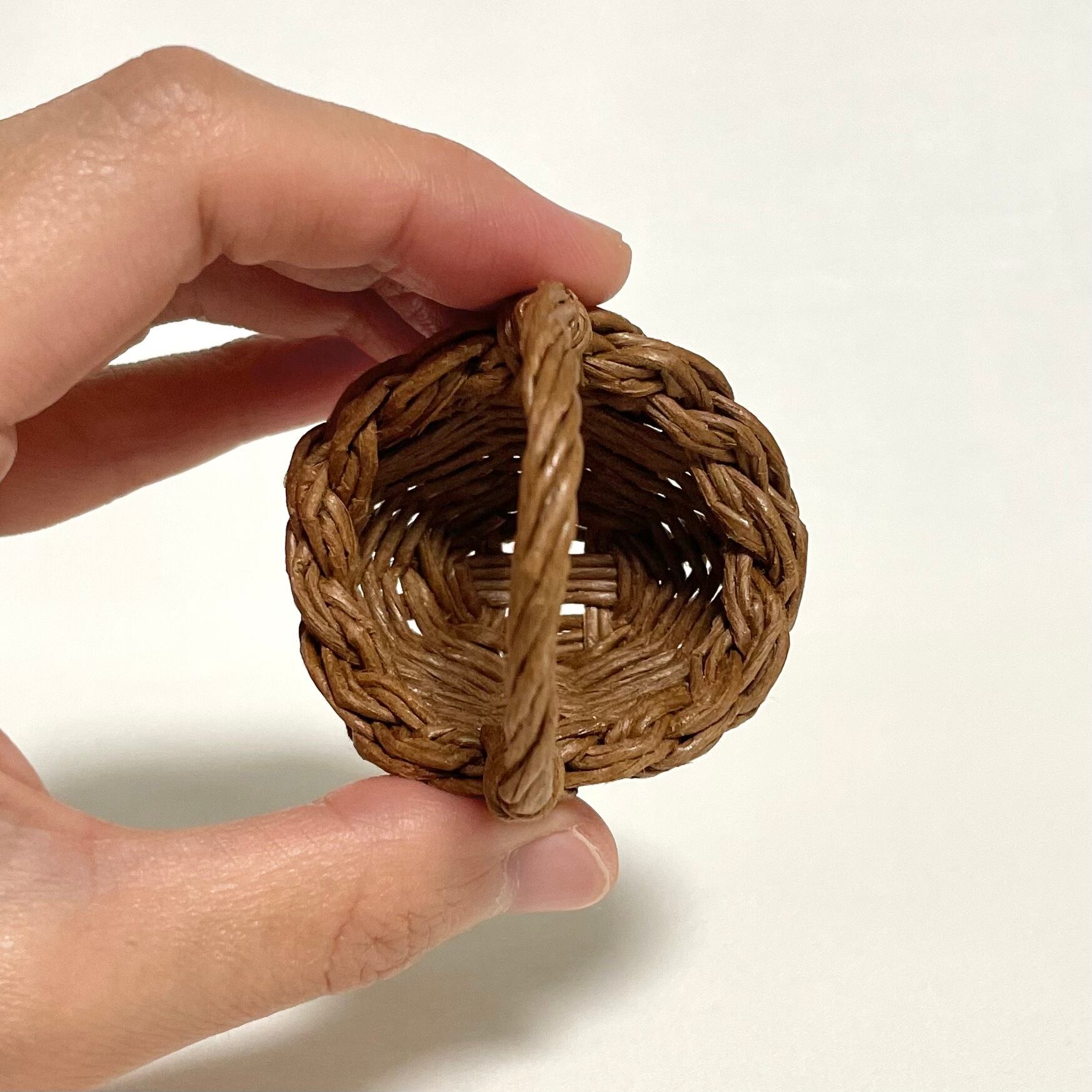 ◾️クラフトバンドを使って、ミニチュアのラタン風カゴバッグを編みました。細部までこだわって、丁寧に作り上げております。縁の表裏部分が三つ編み模様になっているところがポイントです。